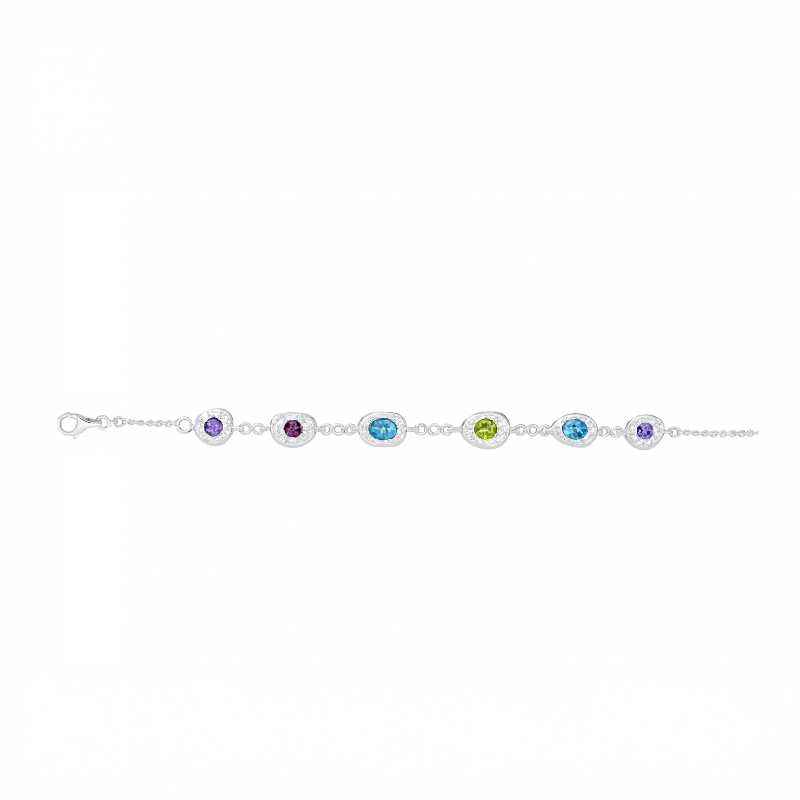 A playful line-up of organic silver pebbles, each dotted with a vibrant gemstones, amethyst, pink CZ, blue topaz tone, peridot, and icy textured silver. Flush-set for a smooth, modern feel and finished with an adjustable chain, this bracelet adds an effortless pop of colour to your everyday stack.