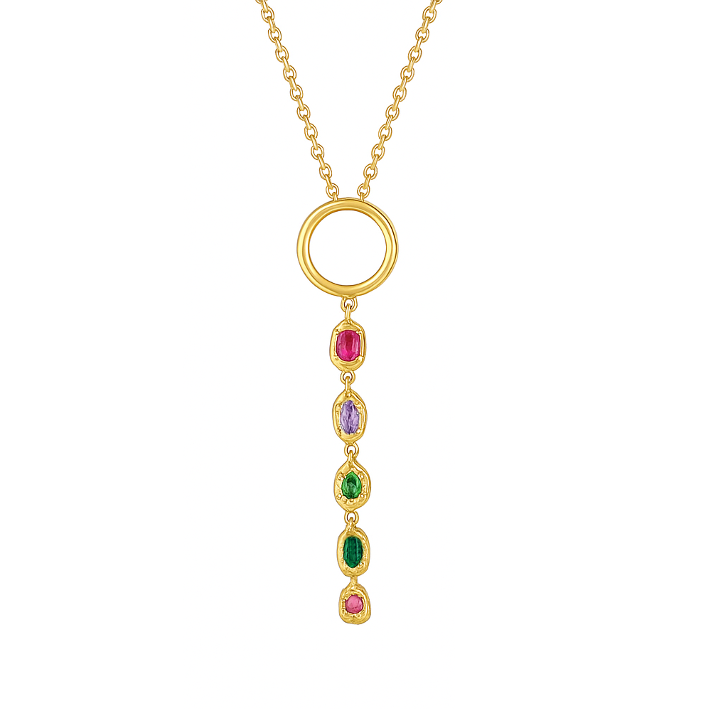 The Gem Drop Lariat strings together a cascade of hand-cut stones, each set in our signature molten bezels, to create a playful, eye-catching line of colour that moves with you. Suspended from a sleek circular loop, every stone brings its own mood: bold, bright, and beautifully imperfect in the most Ritual Frenzy way.