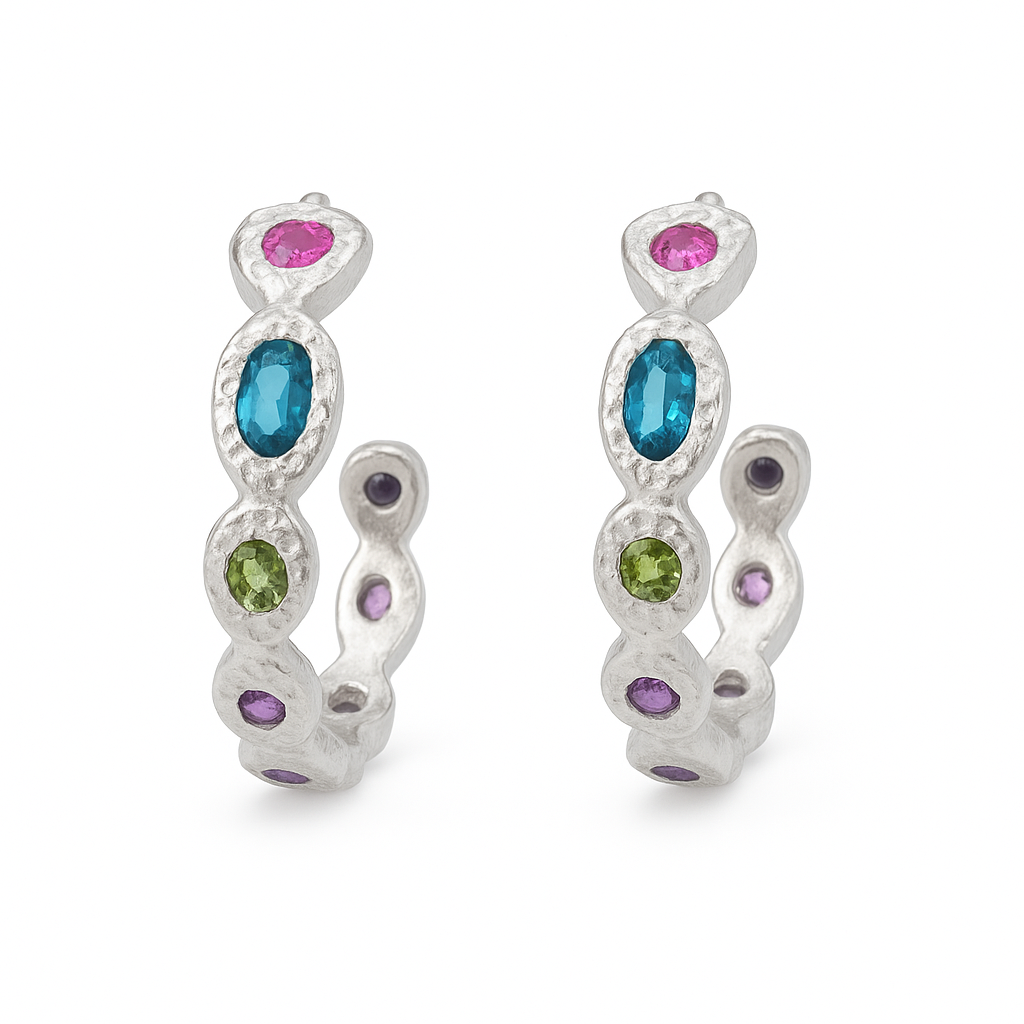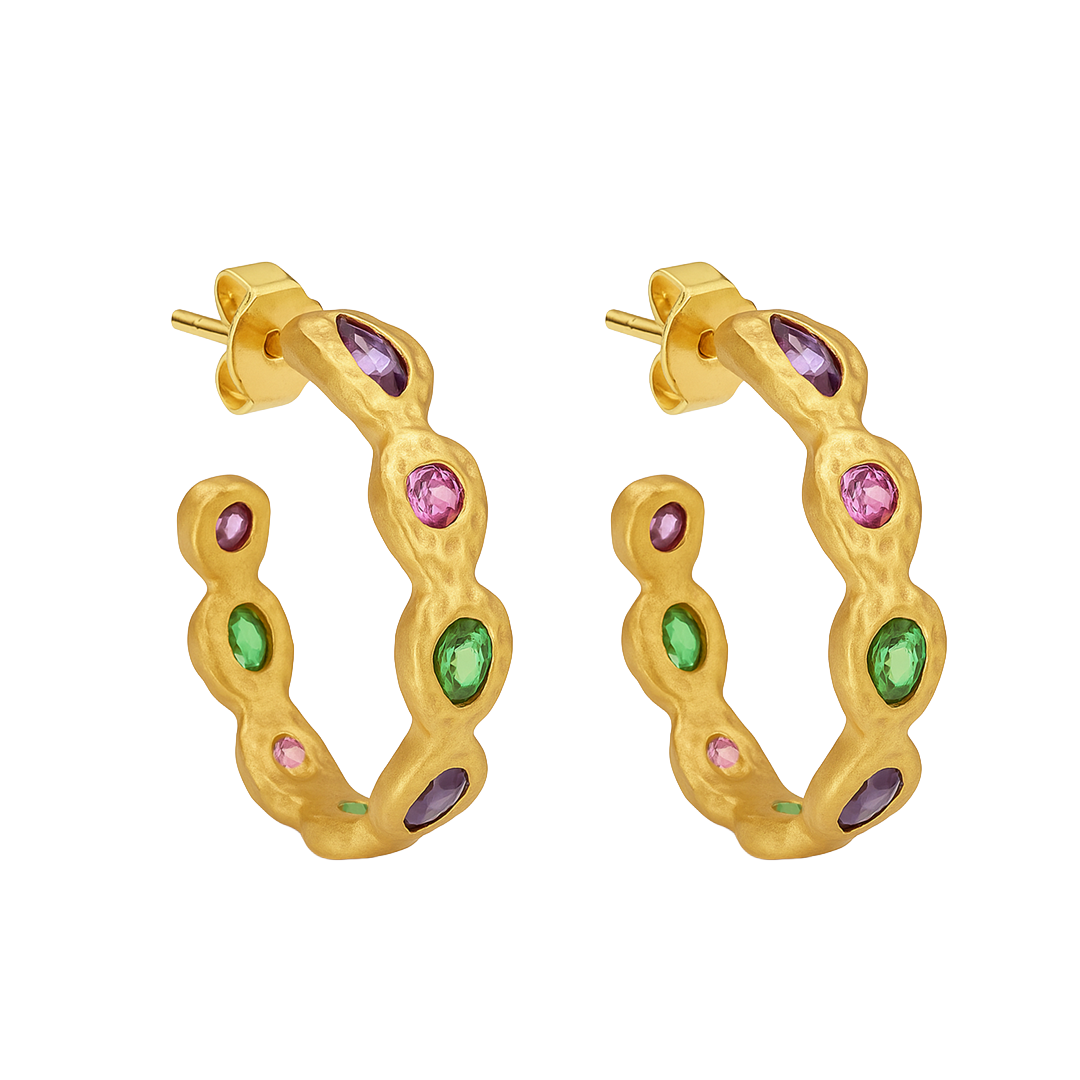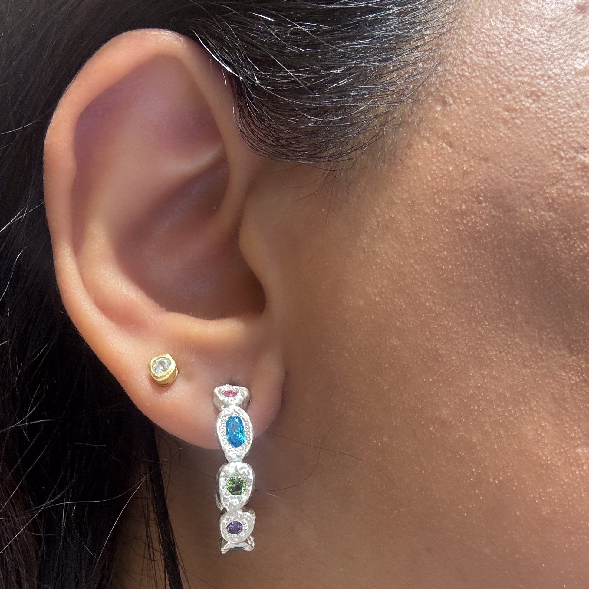Playful, polished, and perfectly off-beat, our Bauble Hoops bring together vibrant gemstones and Ritual Frenzy’s signature beaten texture.